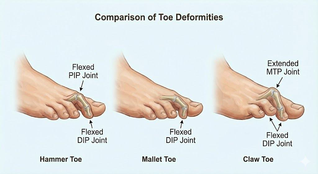 - Claw Toe: כיווץ של שני המפרקים (PIPJ + DIPJ) בשילוב עם יישור יתר בבסיס (MTPJ).