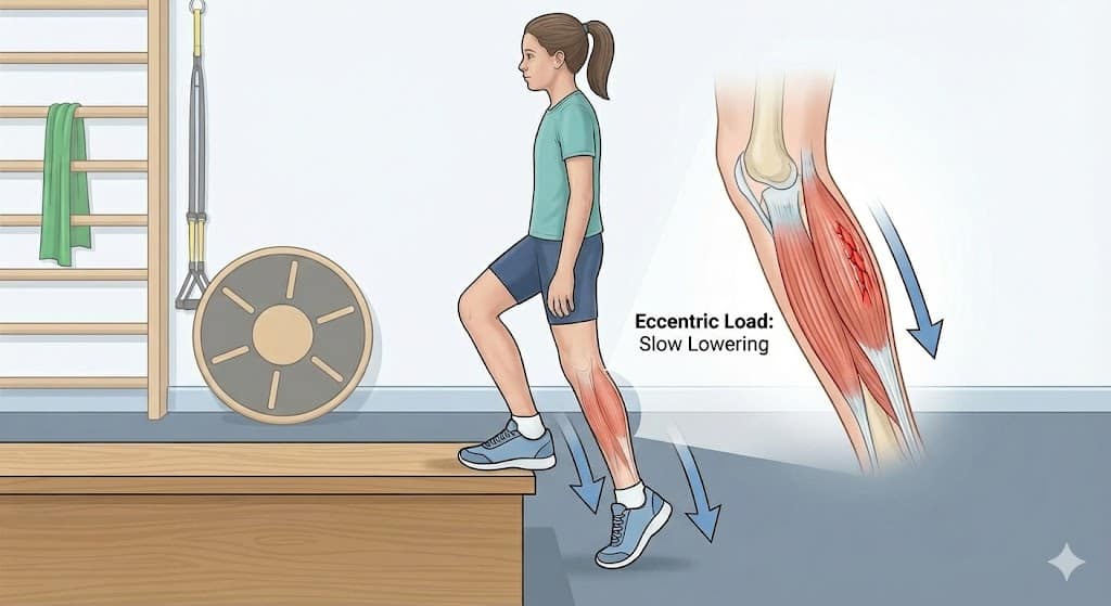 - חיזוק אקצנטרי: לאחר הרגעת הכאב, ביצוע תרגילים לחיזוק הגיד והשריר כדי שיעמדו בעומסי משיכה גבוהים יותר.